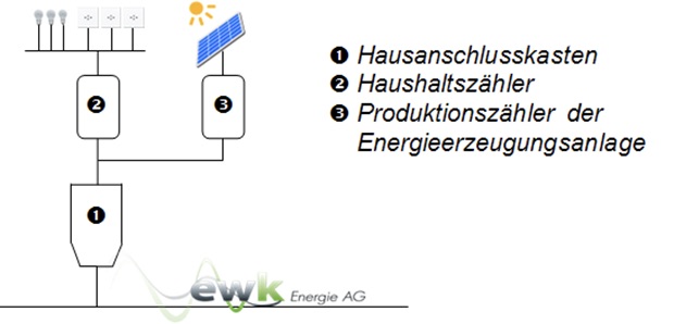 Neben dem normalen Haushaltszähler wird ein zweiter Zähler zur Produktion der Energieerzeugungsanlage eingebaut. Der Zähler misst sämtliche Energie, die produziert wurde. Auf der Abrechnung wird die verbrauchte mit der produzierten Energie verrechnet.